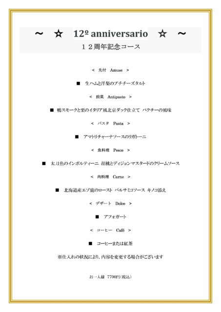 ☆おかげさまで12周年! 10月・11月は12周年を記念したコースなどご用意いたしました。
